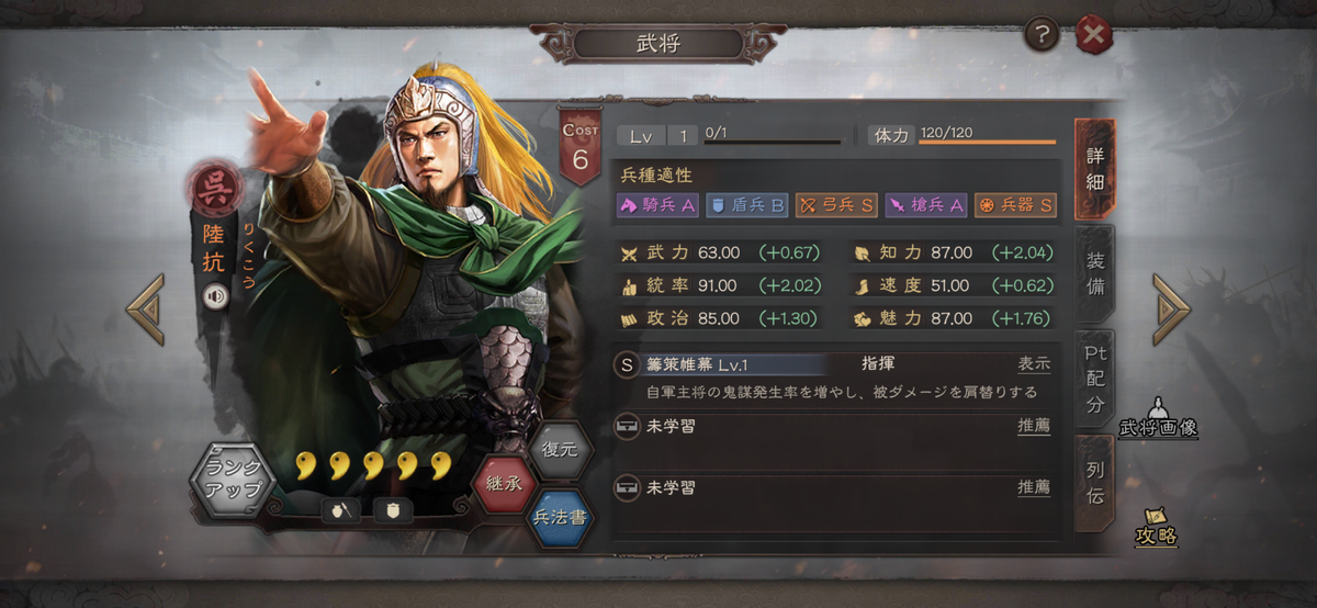 先に結論を述べますと、陸抗は上手く使えばそれなりに強い武将です。敵で出てくるとしたら代用武将としての運用が殆どだと思いますが、使い方によっては最適解となる武将でもあるので、陸抗を当てた方は本ブログを見てみると良いでしょう。